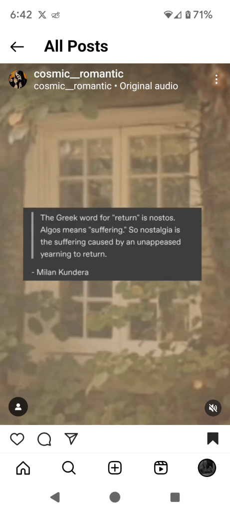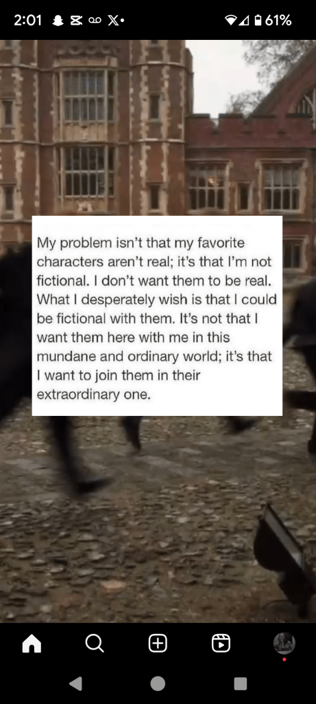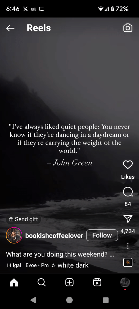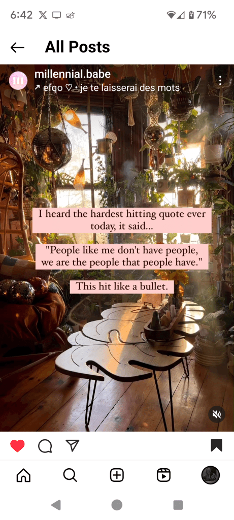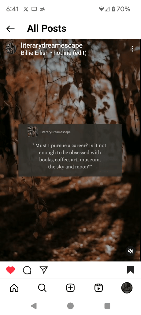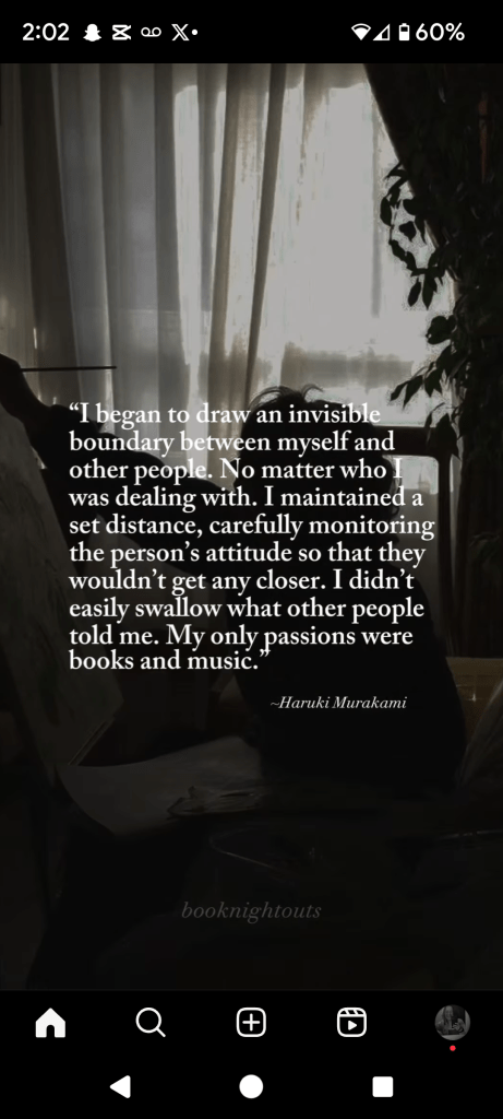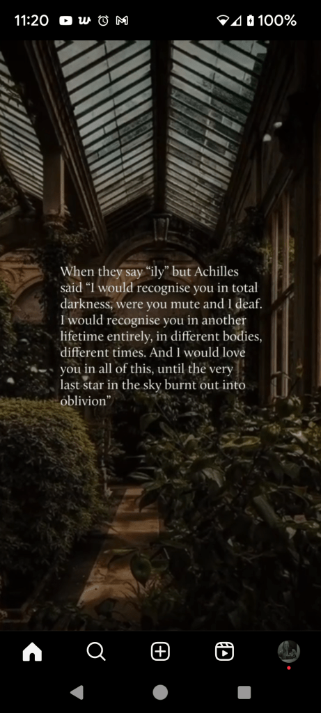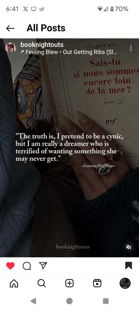 I feel a bazillion times better; still angry for little me, but im happy to be able to accept it; I feel lighter; im told im more relaxed and not hiding my personality from those I would not really show it to. Ive been opening my Instagram more and finding those cheesy yet relatable quotes; some are from like bookishcoffeelover, millennial.babe, cosmic_romantic, and other bookish-themed Instagram accounts. Some are cute as hell, some kinda made me tear up, and some are just cute. These are the ones I screenshot to save; all credit goes to the people who shared these with the internet cause it’s perfectly matched with all scenery.