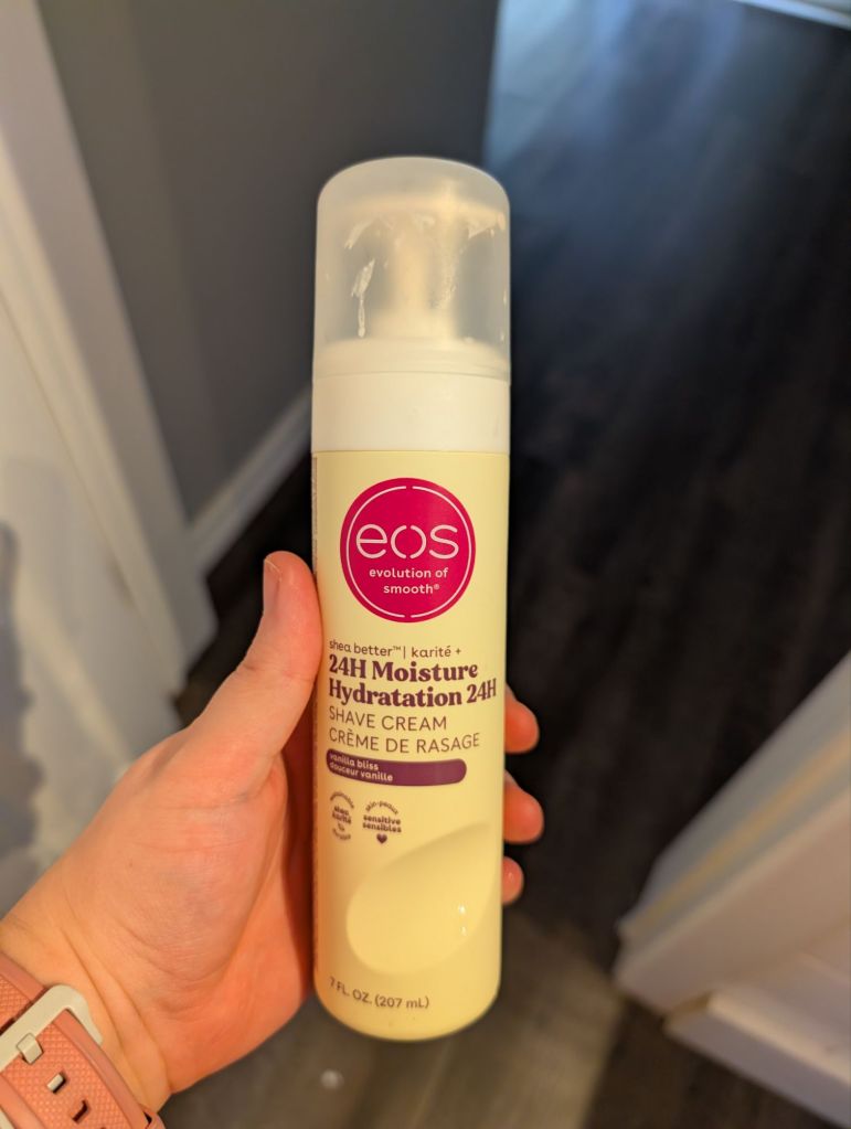 EOS 24H Moisture Hydration 24H shea better Shave Cream: I’ve used several different save creams and this one seems to keep my skin feeling moisturized for longer then 24H. It lasts for about 40 or so hours personally, it may not work for everybody but its something I do reccomend if someone is looking for a good shave cream.
